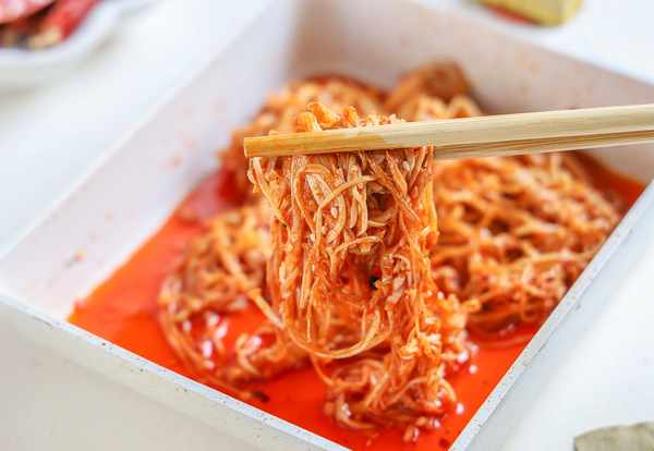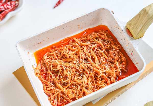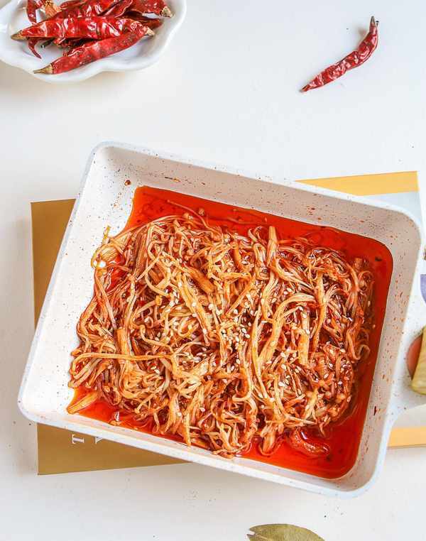 超市裡的罐裝紅油金針菇,香辣又開胃。