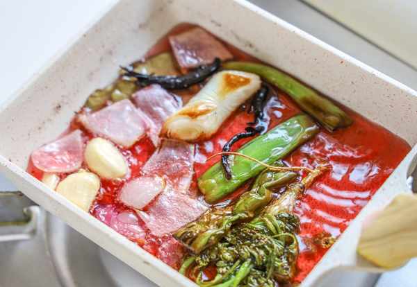 3.香菜+蔥+大蒜+洋蔥+花椒+紫草(紅油的關鍵)用油炸至焦色,然後用漏網過濾出香料扔掉