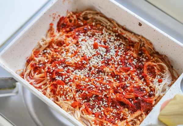 2.辣椒粉的用量根據個人喜歡的辣味來定,加上點芝麻是為瞭讓整體看上去更加美觀,但記得要放熟的