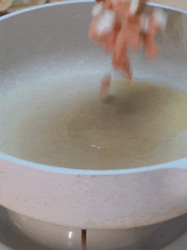 油熱爆香火腿腸丁、香菇丁、皮蛋丁、蝦肉丁