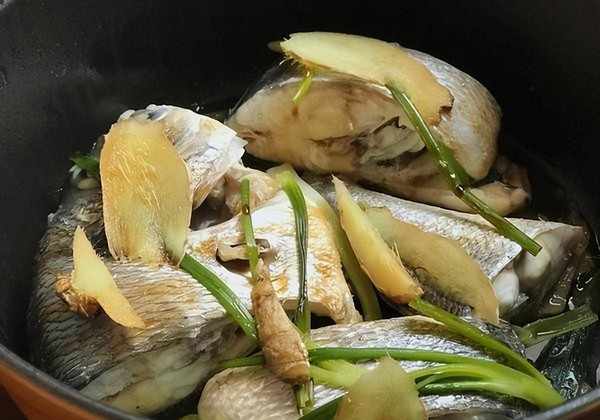 加入黃骨魚塊,加入適量的料酒、生抽、胡椒粉、糖和水,燜煮 5 分鐘。