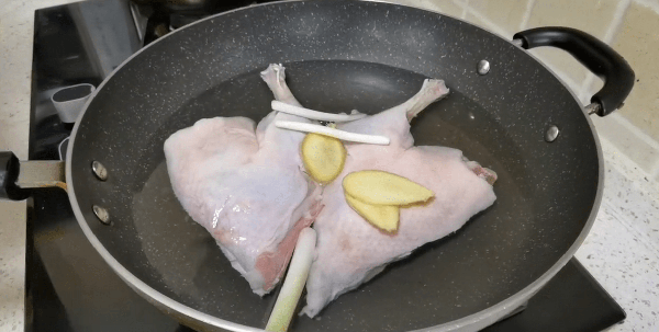 1.鴨腿清洗幹凈,冷水下鍋,加入適量薑片和蔥段,倒點料酒,大火煮開,撈出來洗掉浮沫。