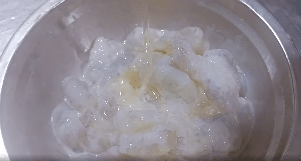 3.處理好的蝦仁裡加入適量食鹽、白糖和四分之一個蛋清,抓勻,然後加入適量生粉,繼續抓拌,再加入適量色拉油,蝦仁就醃制好瞭。