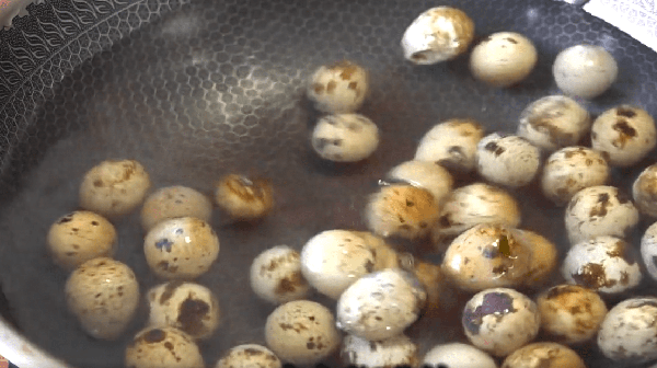 2.鵪鶉蛋中火煮8分鐘,撈出來冷水降溫,然後去掉皮。