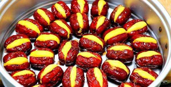 1、紅棗沖洗幹凈,用小刀切開一側,取出裡面的果核,去殼後備用。一小塊南瓜切片蒸熟。