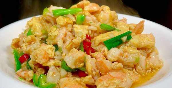 4、青椒切成小段。油熱之後把大蝦雞蛋液放入鍋中。煎制定型,翻炒均勻以後,將它盛出來,把薑、蒜末、小米辣炒香,再把蝦仁雞蛋放入鍋中,開大火快速翻炒均勻。再把青椒,蔥段、料汁也加進來,快速翻炒均勻之後,蝦仁滑蛋就做好瞭。