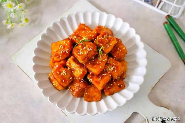 【材料】:豆腐1塊,生抽2勺,醋2勺,番茄醬1勺,糖1勺,淀粉1勺,白芝麻適量