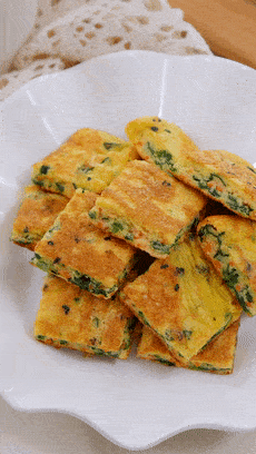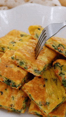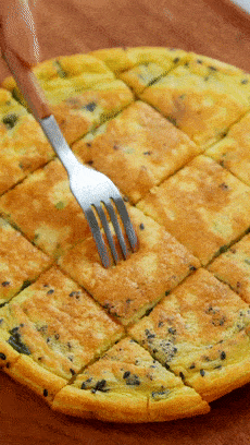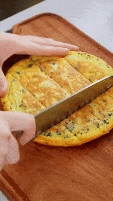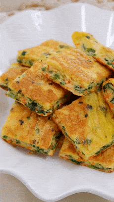 一直烙到蛋餅兩面都是金黃的瞭,用筷子紮一下,或者嘗一口,確認熟透就能出鍋。出鍋的大餅切成這樣的小塊,娃自己拿著吃,不僅更方便,還能鍛煉孩子自主進食的能力。