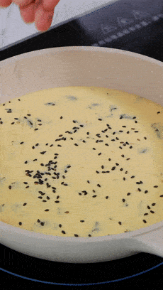 開小火給蛋餅烙到底面定型上色,撒上黑芝麻提香點綴一下。