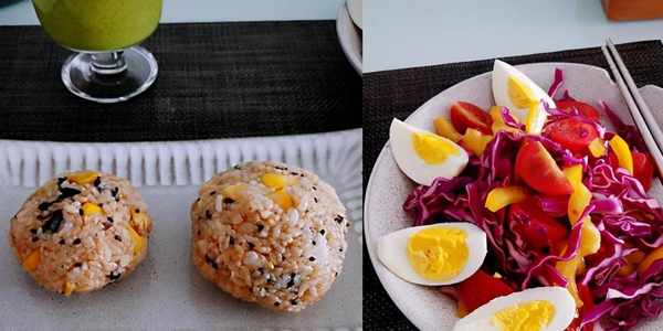 芹菜蘋果汁|甜玉米糙米飯團|水煮蛋|拌紫甘藍