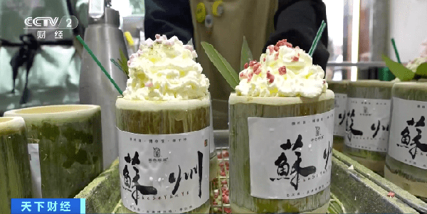 翠綠的竹筒,搭配綿密的奶油雪頂,和花果凍幹的裝飾,再貼上“蘇州”字樣的城市標簽,這樣的組合新潮搶眼。