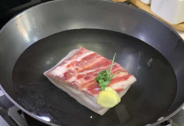 步驟1:五花肉清洗幹凈,然後整塊下鍋,加冷水,然後加些蔥薑和料酒,大火燒開,轉小火燉煮20分鐘,把五花肉燉熟,裡面都熟透瞭光火備用。