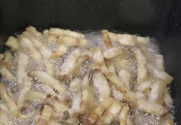 步驟3:接著把切好的五花肉放入鍋中,這個時候不用加油,開火把五花肉的油脂煸炒出來,看到鍋底有一層底油的時候,放入紅蔥酥,一起翻炒片刻。