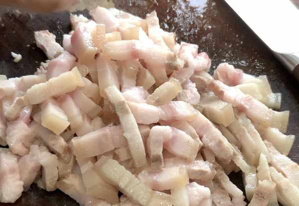 步驟2:接著把煮熟的五花肉切成小塊,切成平時點外賣吃的鹵肉的大小就可以瞭。做鹵肉飯,五花肉一定不要切太大塊瞭,吃起來會膩。