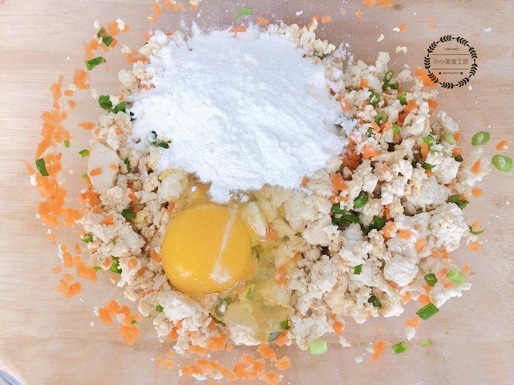 【食材】:豆腐,雞蛋,胡蘿卜,面粉,小蔥,食鹽,生抽。