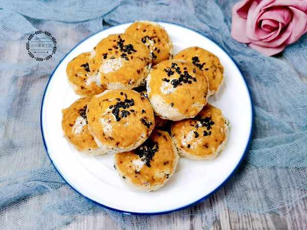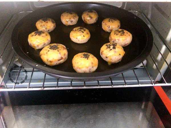 3、接著將其分成大小均等的小面團,搓圓後抹上蛋黃液撒上黑芝麻,放入烤箱180度烤15分鐘即可。