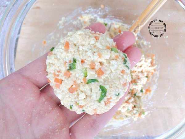 3、最後將取一團豆腐泥按壓成小餅的形狀。