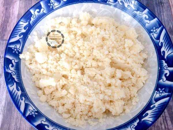 1、面粉中加入少許白糖和玉米油,攪拌成酥酥的面絮。