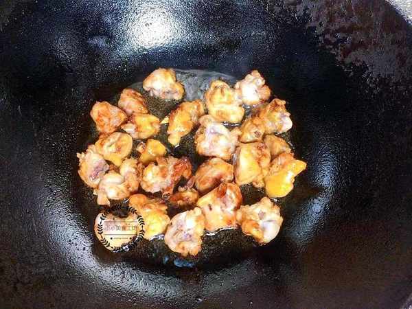 1、將雞肉洗凈後剁成小塊,冷水下鍋焯燙後盛出,油鍋中放入冰糖炒出糖色,倒入焯好的雞肉拌勻。