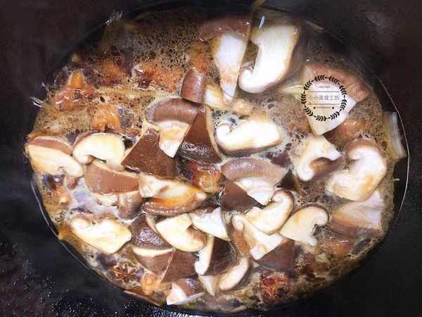 3、然後倒入沒過食材的開水和提前處理的香菇塊,大火煮開後轉小火燉20分鐘。