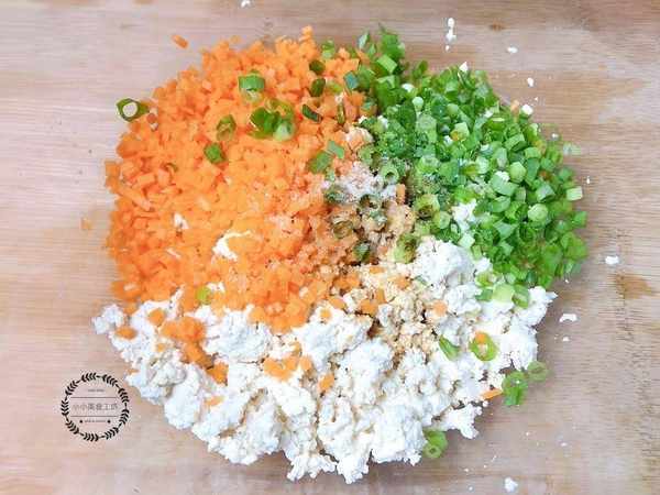 1、將胡蘿卜和小蔥洗凈後切碎,豆腐用手抓碎,將其三種食材放入盆中,加入少許食鹽,生抽和五香粉攪拌均勻。