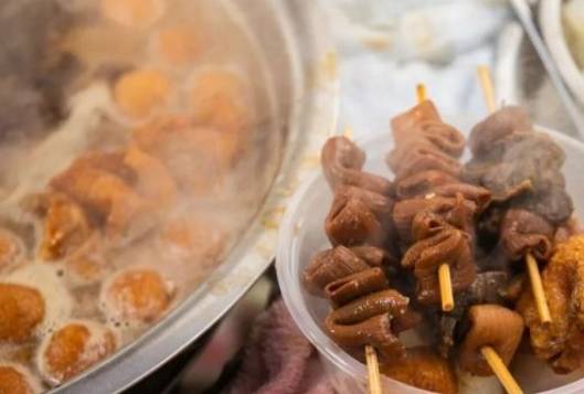阿婆做牛雜是提前煮熟各種牛雜,然後放到調好鹵汁的鍋裡小火慢燉,鍋裡除瞭牛雜以外還有各種魚蛋蝦餃豆腐泡還有廣東菜系常見的蘿卜,起初各種牛雜和魚蛋蝦餃都是隨意放在鍋裡燉,後來為瞭讓每一個食客吃的數量都一樣,阿婆精心把加工好的牛腸牛肺牛百葉等牛雜用竹簽子串起來,每一串分量幾乎是一樣的。