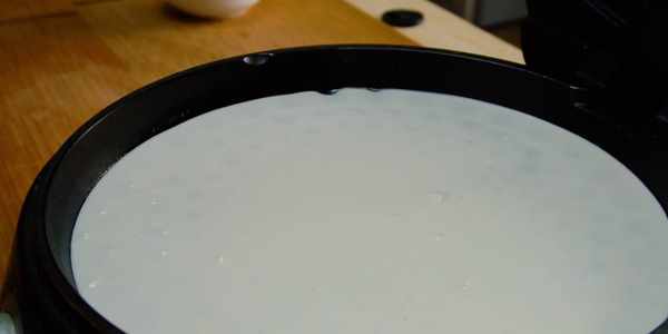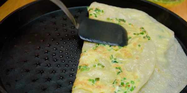 烙這個餅不需要餳面,攪拌成合適程度的面糊之後,打開電餅鐺刷一層薄油,取適量的面糊平鋪均勻,借助刮板會更好操作一些,蓋上蓋子上下層開最大火一起加熱,