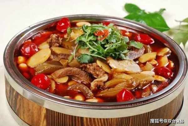 原料:牛百葉150克,牛彎扣(結腸)、雙合香糯糟辣醬50g、牛蹄筋各100克;牛肝菌、青筍、油菜子、黑木耳各100克;薑、蒜頭各20克;香萊少量。