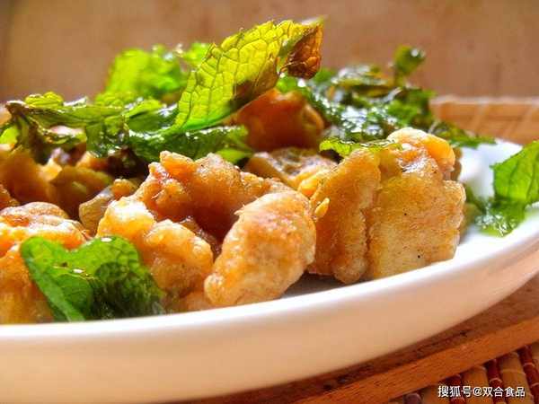 原料:雞肉250克,薄荷葉10克,雙合香糯糟辣醬50g,酥炸粉5克,蛋1個,清水15克、調味品:鹽3克,水淀粉20克,食用油750克(約耗50克)。