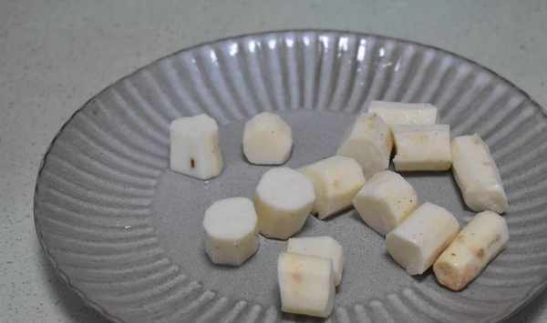 2山藥削皮切小段,在給山藥削皮前,要戴上手套,以防山藥導致過敏。