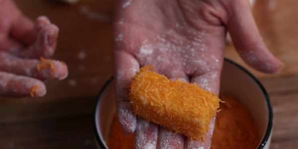 8、切好的奶凍裹上一層淀粉,再沾上一層蛋液,最後裹上面包糠。裹面包糠的時候可以稍微按壓一下,方便沾的更緊實一些。