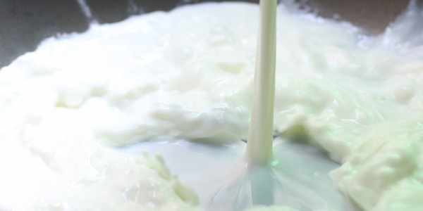 3、將攪拌好的牛奶倒入鍋中。小火加熱,邊加熱邊攪拌,一定要小火,而且要不停攪拌,不然會糊底。