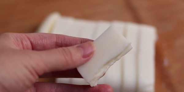 7、成型後的奶凍倒扣脫模,切成塊狀。我用的玻璃容器,沒有刷油成型後也是非常容易脫模的。做好的奶凍按壓是非常有彈性的。