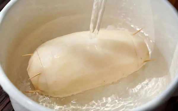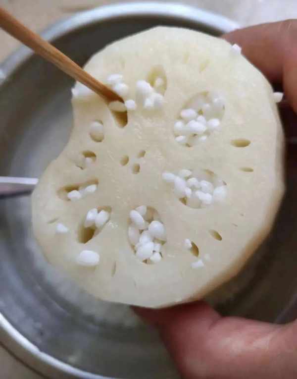3、蓮藕塞糯米之前,一定要將蓮藕孔反復用水清洗幹凈,避免殘留淤泥。