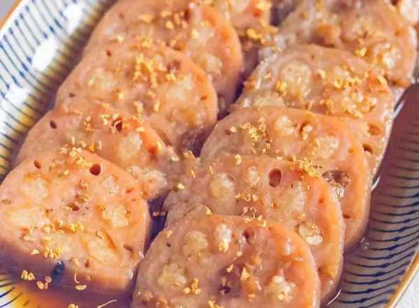 起鍋晾涼,淋上金黃誘人的桂花湯汁,撒上桂花裝飾。藕紅肉酥,湯汁紅亮黏稠。(切蓮藕片時,記得帶上一次性手套)