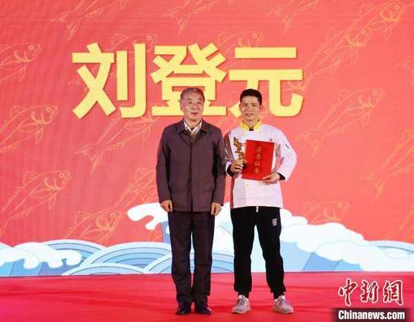 中國烹飪協會副會長喬傑(左)為2023全國大黃魚美食烹飪大賽冠軍頒獎。 林榕生 攝