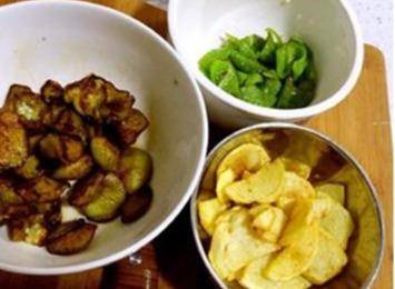 3.將500ml油入鍋,燒至約5成熱時加入土豆炸至略變金黃撈出。將油溫提高至8成熱,將茄子擠去醃漬出來的水,入鍋炸至略變色後再將炸過的土豆和青椒入鍋,與茄子一起大火炸約十幾秒鐘瀝油,盛出。