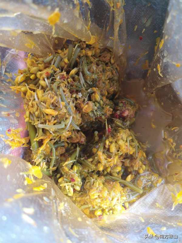 采摘的花多瞭,像油菜花、苦刺花、棠梨花母親就用鹽醃制,裝進土罐儲起來,一道金黃色和翠綠色相間油菜花醃菜會在飯桌使我們天天胃口大開,陪著男主人佐酒一個多月。或者在院子裡曬幹等沒菜的時候用來做菜,煮在臘肉、火腿、臘排骨、臘豬腳等湯裡。