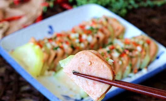 午餐肉切成合適的大小,厚度跟冬瓜一樣就可以瞭。午餐肉本身有咸味,這道菜就不需要放鹽瞭。