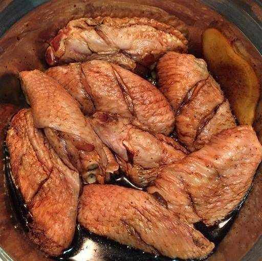 第三步,將中火調至小火,再往鍋裡面倒入可樂,可樂一定要沒過雞翅,然後再加入一兩個八角,最後靜靜等待收汁。大約要燉半個小時,半個小時快到的時候,註意觀察鍋裡面收汁的情況,如果汁水比較多,可以調成大火收汁。這一步驟可以根據自己的口味加加入適量的鹽或者冰糖。