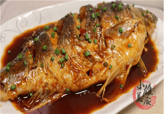 10.把湯在鍋裡煮開後,把火關小,慢慢燉。在這個過程中,你可以用勺子舀起湯,然後把它倒在魚身上。慢燉大約十分鐘。首先,把魚撈出來,然後把湯裡的大料撈出來。加入半碗水和淀粉使湯變稠,將濃汁均勻地澆在魚身上,撒上一點蔥花裝飾一下,就很美味瞭。