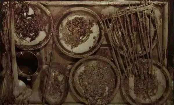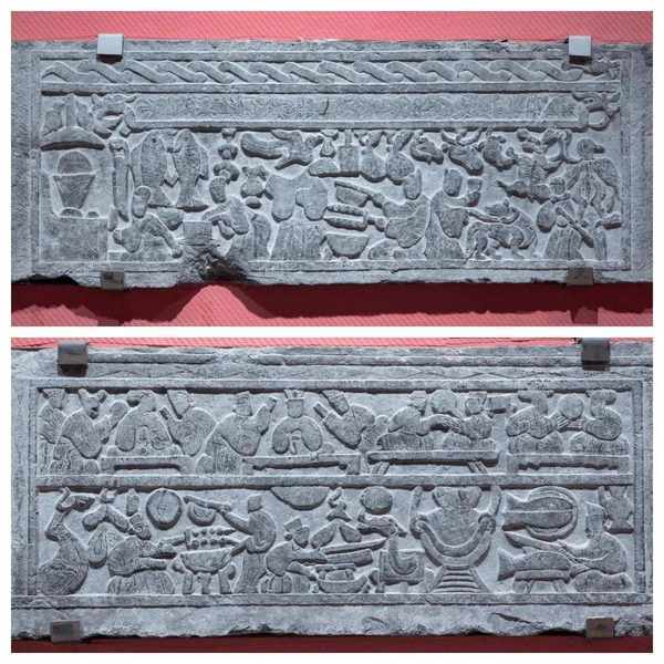 馬王堆辛追墓巨型槨室北面的頭廂裡有一張矮矮的漆案,上面擺著全套的餐具,五盤菜、一碗湯、一碗酒,還有幾串烤肉串。這和漢畫像石庖廚題材的畫面相差無幾。