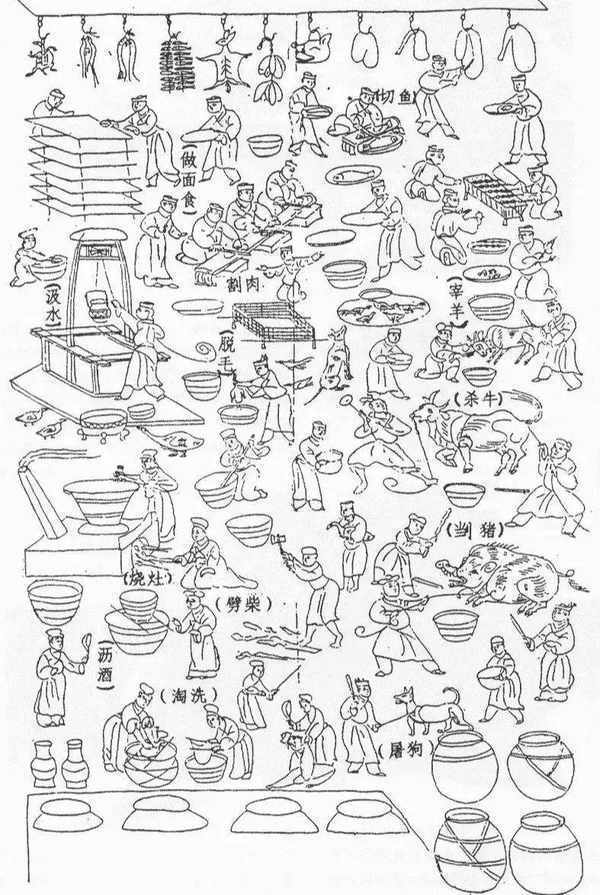 山東諸城前涼臺漢畫像石上的《庖廚圖》(拓片),為我們展現瞭宰羊、汲水、切菜、劈柴、烤肉的情景。
