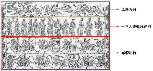 臨沂五裡堡迎賓、車馬出行漢畫像石。畫面共分四層,每層內容各有不同。