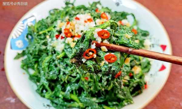 2.準備適量的蒜粒、紅辣椒段,撒在刺兒菜上,加入適量的鹽、生抽和香油,澆上熱油,激發出蒜粒和紅辣椒的香味,然後用筷子翻拌均勻,即可食用。