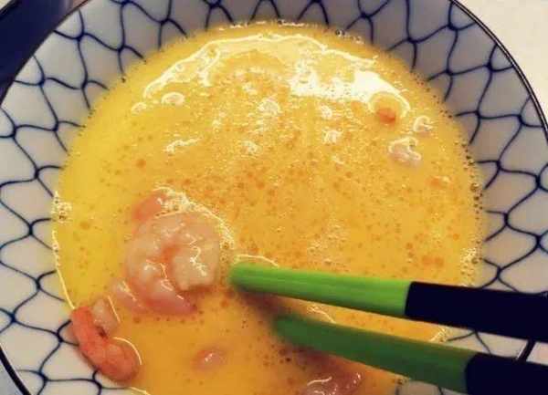 ▲2、雞蛋液熟得快,所以蝦仁一定要燙一下水,或者下油鍋炸,事先做熟,與雞蛋拌勻下入鍋中翻炒,以保持蝦仁Q脆,而且也不覺得味道太柴。