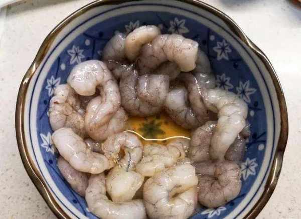 冰凍蝦仁在充分解凍之後,洗凈後用廚房紙吸去面上的水,放入碗中,加少量白胡椒粉和酒,抓勻後醃10~30分鐘,以除去蝦腥味。