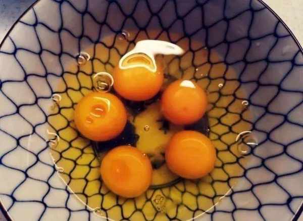 五個蛋悉數打入碗中,加少量鹽,迅速攪打均勻,成為雞蛋液,加少量雞精、料酒和3湯匙牛奶,並使之拌勻,拌勻。