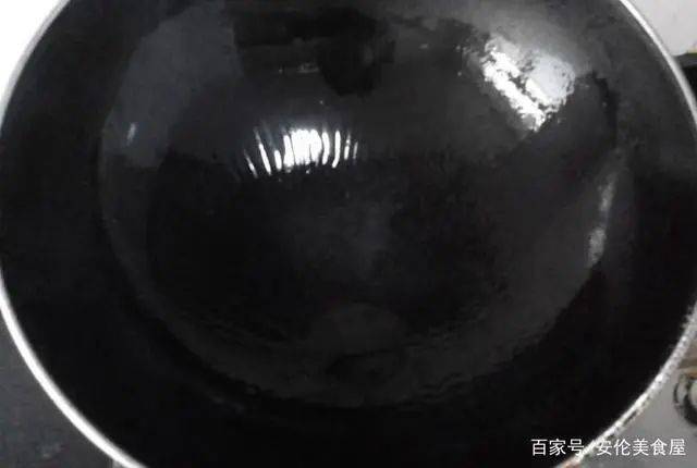 第二步:鍋置火上加熱,鍋燒熱後,倒油,油溫約燒到6-7成熱時,端起鍋子來回搖晃,讓鍋壁全部粘滿一層油後熄火冷卻油溫。