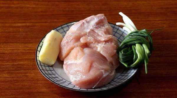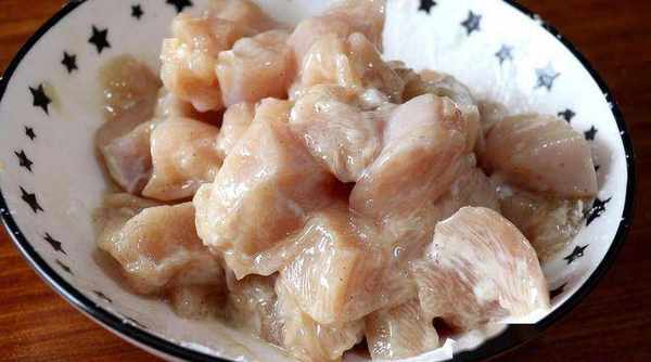 2、 雞胸肉用刀背拍一拍方便入味,切成小塊,放入大碗中加入適量鹽、料酒、蔥薑水、淀粉,用水抓勻醃制一下。